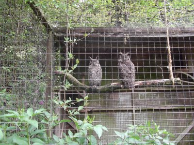 Owls are very much at home in their spacious enclosure. |